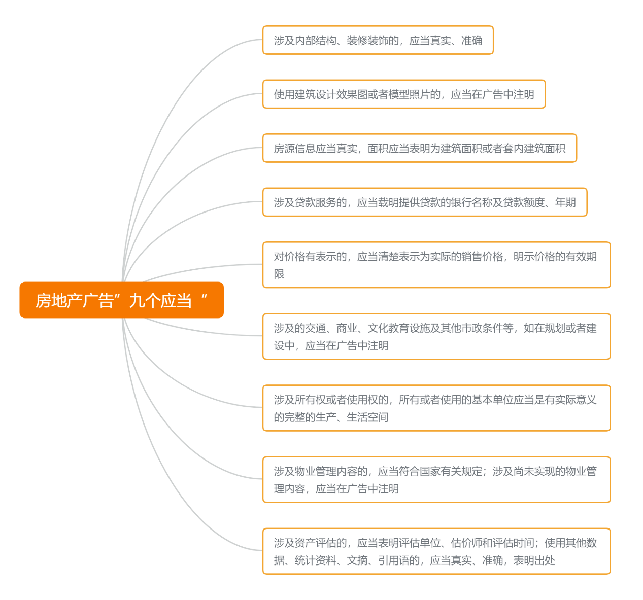 除《廣告法》中規(guī)定的廣告不得有的情形及禁用的詞語(最高級用語)外,房地產(chǎn)廣告還應(yīng)注意如下“九個應(yīng)當(dāng)”: